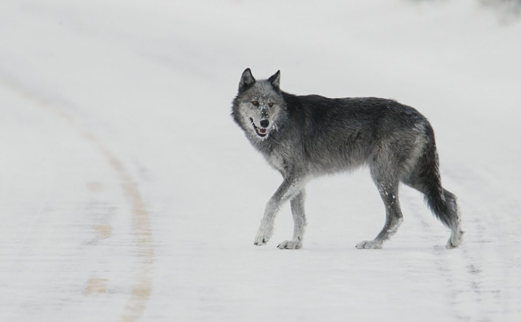 (مصدر الصورة: “الذئب الأسود والرمادي (أنثى من مجموعة Druid، ‘Half Black’) يمشي في الطريق بالقرب من جسر نهر لامار” بواسطة YellowstoneNPS تم وضع علامة عليه بعلامة المجال العام 1.0.)