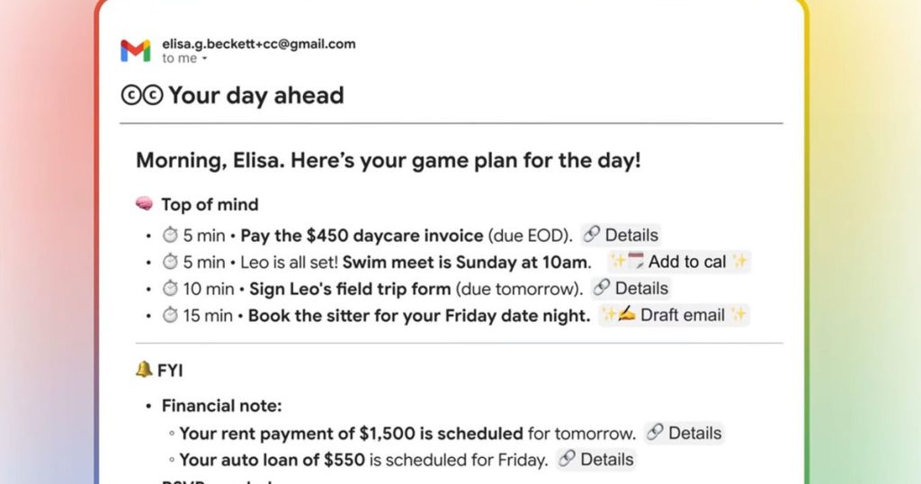 يقدم “CC” ملخصًا يوميًا بعنوان “يومك القادم” (Your Day Ahead) يجمع بين المواعيد والمهام والتحديثات الهامة. وفقًا لجوجل، فإن هذا الملخص مصمم ليكون واضحًا وموجزًا، مما يوفر للمستخدمين الوقت والجهد في تجميع المعلومات بأنفسهم. على سبيل المثال، قد يتضمن الملخص تذكيرًا بدفع فاتورة أو الاستعداد لاجتماع مهم.