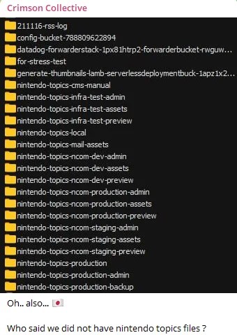 تزعم مجموعة القرصنة Crimson Collective اختراق ملفات نينتندو، مرفقةً لقطة شاشة لعدة مجلدات كدليل. من بينها أصول إنتاجية، ومعاينات تطويرية، ونسخ احتياطية. لا تتوفر معلومات كافية حتى الآن حول نطاق الاختراق، أو ما تنوي كريمسون كوليكتيف فعله بالبيانات التي تزعم حصولها عليها، ولكن يمكننا النظر إلى هجومها الأخير على Red Hat لتكوين فكرة عامة.