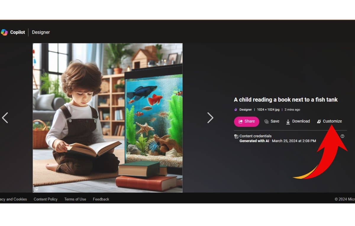 2- اكتب مطالبة لإنشاء صورة، مع إضافة وصف دقيق لتفاصيل الصورة التي تريدها، على سبيل المثال: أنشئ صورة لطفل يقرأ كتابًا وبجانبه حوض أسماك.