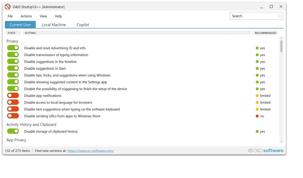 ميزات رئيسية لـ O&O ShutUp10++