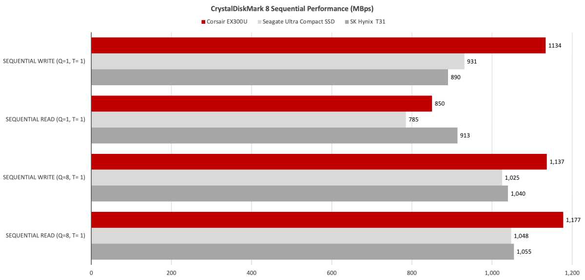بغض النظر، كان EX300U أسرع بسهولة في اختبارات CrystalDiskMark 8 المتسلسلة من منافسة 10 جيجابت في الثانية المذكورة أعلاه.