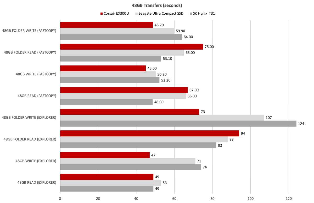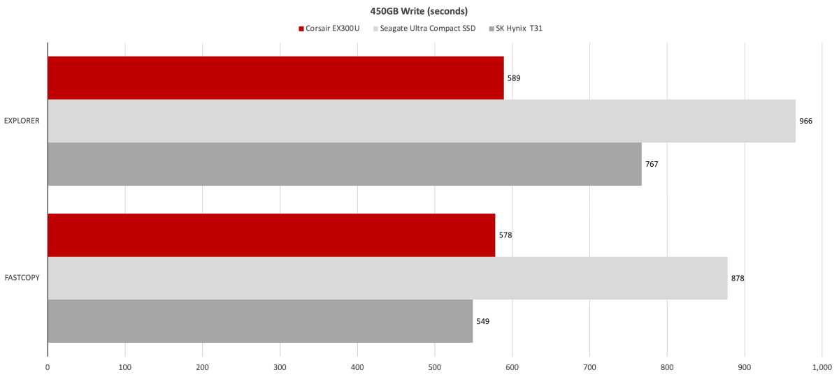 بينما كان T31 أسرع باللمس مع FastCopy، كان EX300U يتصدر Windows Explorer في كتابة 450 جيجابايت على خلاياه.