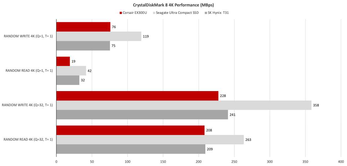 يعد الطراز EX300U أداءً جيدًا لمحرك أقراص SSD بسرعة 10 جيجابت في الثانية. إنه مختلف في الشكل، ولكنه قابل للمقارنة من حيث الحجم والوزن مع محركي الأقراص الإبهام بسرعة 10 جيجابت في الثانية (Seagate Ultra Compact SSD وSK Hynix Tube T31) مقارنة بالرسوم البيانية.