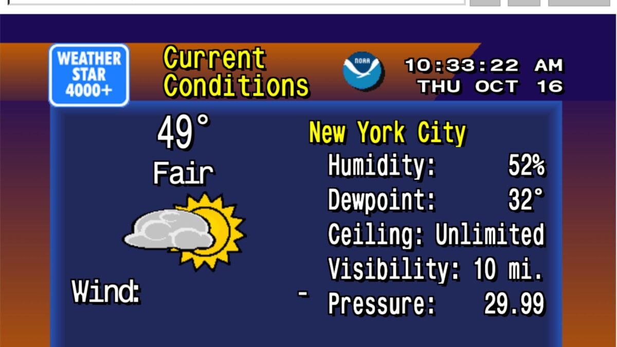 لقد كان وقتًا أبسط مليئًا بموسيقى الجاز والنصوص التليفزيونية الهادئة المحيطة. إذا تنفست للتو الصعداء الثقيل من الشوق، يا فتى، لدي أخبار لك. شاهد WeatherStar 4000+، وهو عبارة عن إعادة إنشاء على شبكة الإنترنت لموسيقى الجاز الجمالية لقناة Weather Channel في التسعينات وكل شيء. يوفر الموقع، الذي أنشأه المبرمج مات والش، تنبؤات جوية دقيقة لأي موقع تكتبه في شريط البحث.