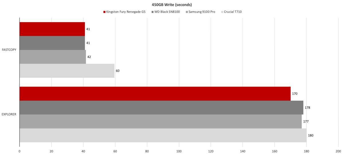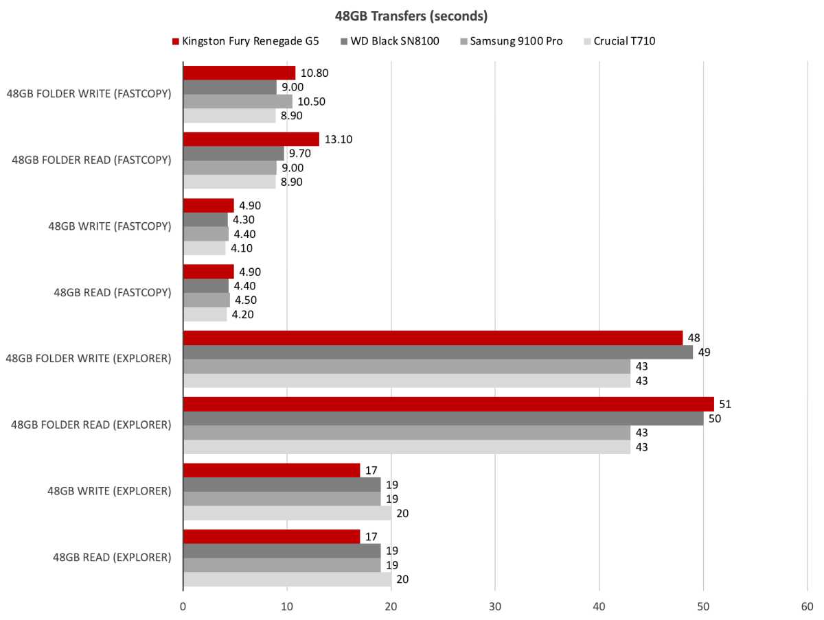لقد كان بضعة انتصارات في الجزء المستكشف من اختبار نقل 48 جيجابايت هو الذي أعطى Fury Renegade G5 نتيجة جيدة. ومع ذلك ، لم يكن بهذه السرعة في Fastcopy مثل الآخرين.