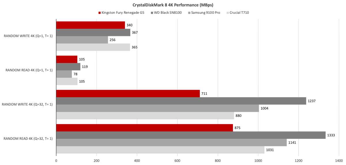 لم يكن الأداء العشوائي في قائمة الانتظار سيئًا ، ولكنه ليس قويًا مثل الكتابة المتسلسلة لـ Renegade G5 (أو محركات الأقراص الأخرى). لقد تميزت WD Black SN8100 هنا على الأرجح أفضل SSD لتشغيل نظام تشغيل عليه.